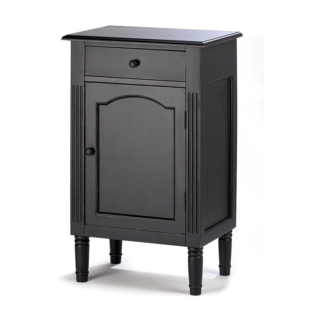 This charming hand-painted cabinet has so many uses - an appealing end table next to sofa beside the bed as a handy nightstand or an attractive catch-all cabinet for a home office or bath! Attractively weathered matte-black finish and a simple shape allow this winsome furnishing to blend in with most any decor. Features one drawer above a generous single-door storage space. Some assembly required. MDF wood. 18" x 12 1/2" x 29" high.