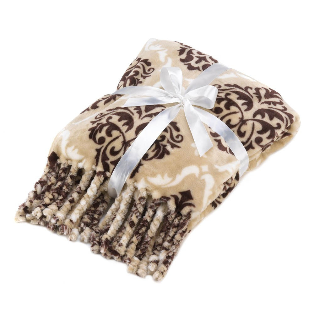 Gorgeous to look at gorgeous to wrap up with! This beautiful taupe and brown blanket features an all-over Baroque pattern thats finished off with fanciful tassels. Cuddle up and enjoy!