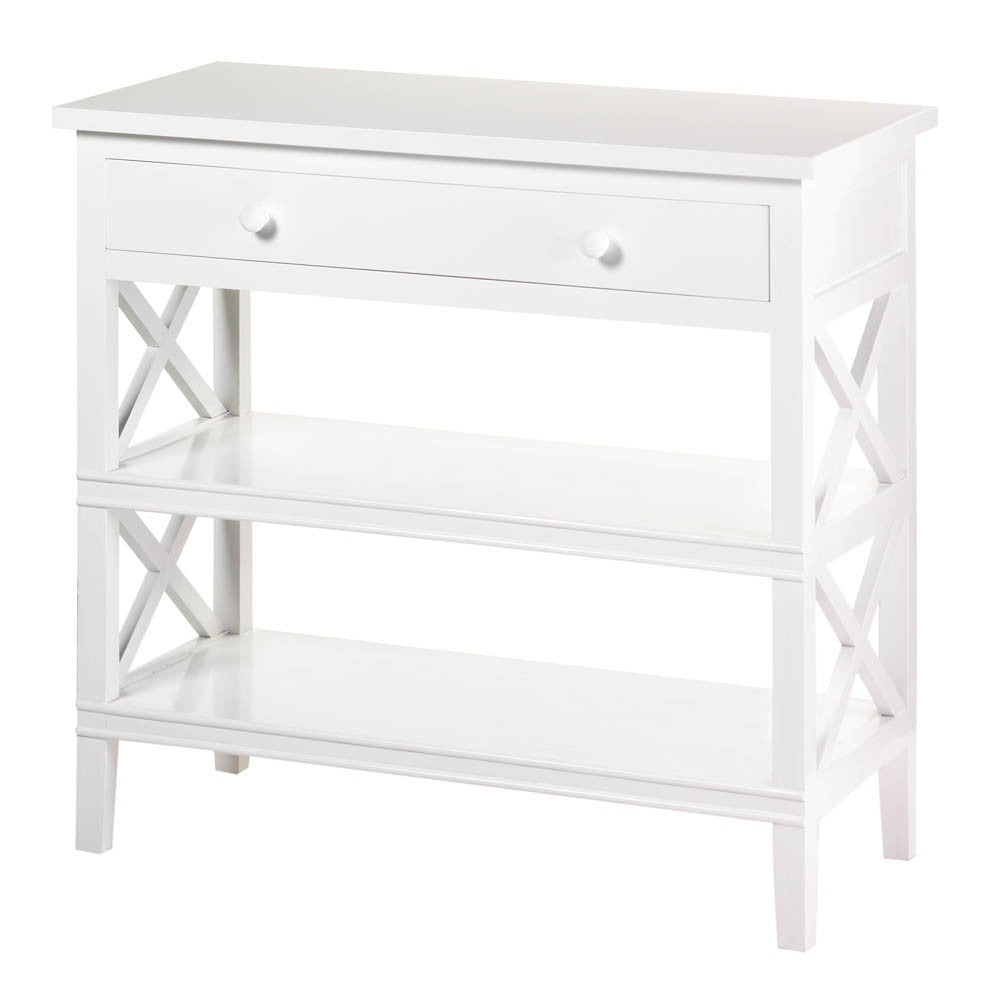 The fresh white finish of this elongated table makes its crisp and modern lines really stand out. Perfect for your hallway or behind the sofa the table features a pullout drawer and two lower display shelves for endless decorating power.