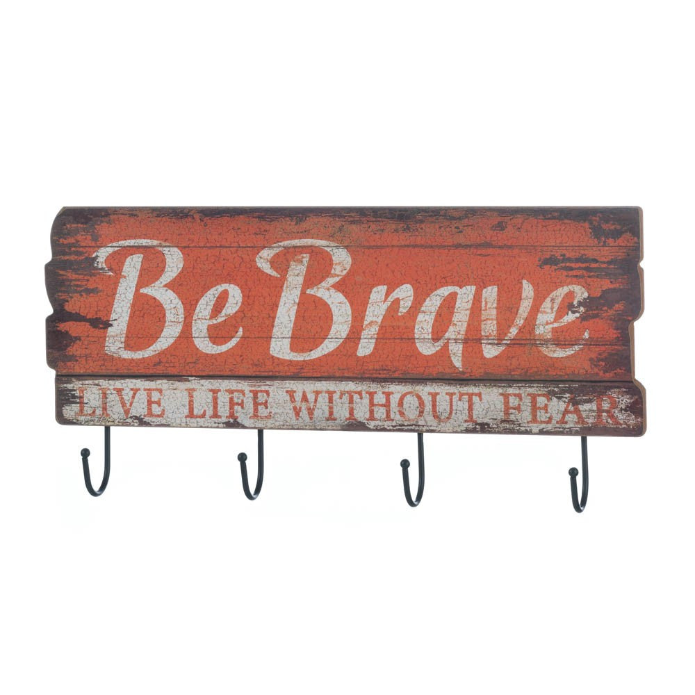 Be brave and organized with this charming and rustic wall decor. Four iron hooks hang below a vintage-style orange sign that reads Be Brave Live Life Without Fear.