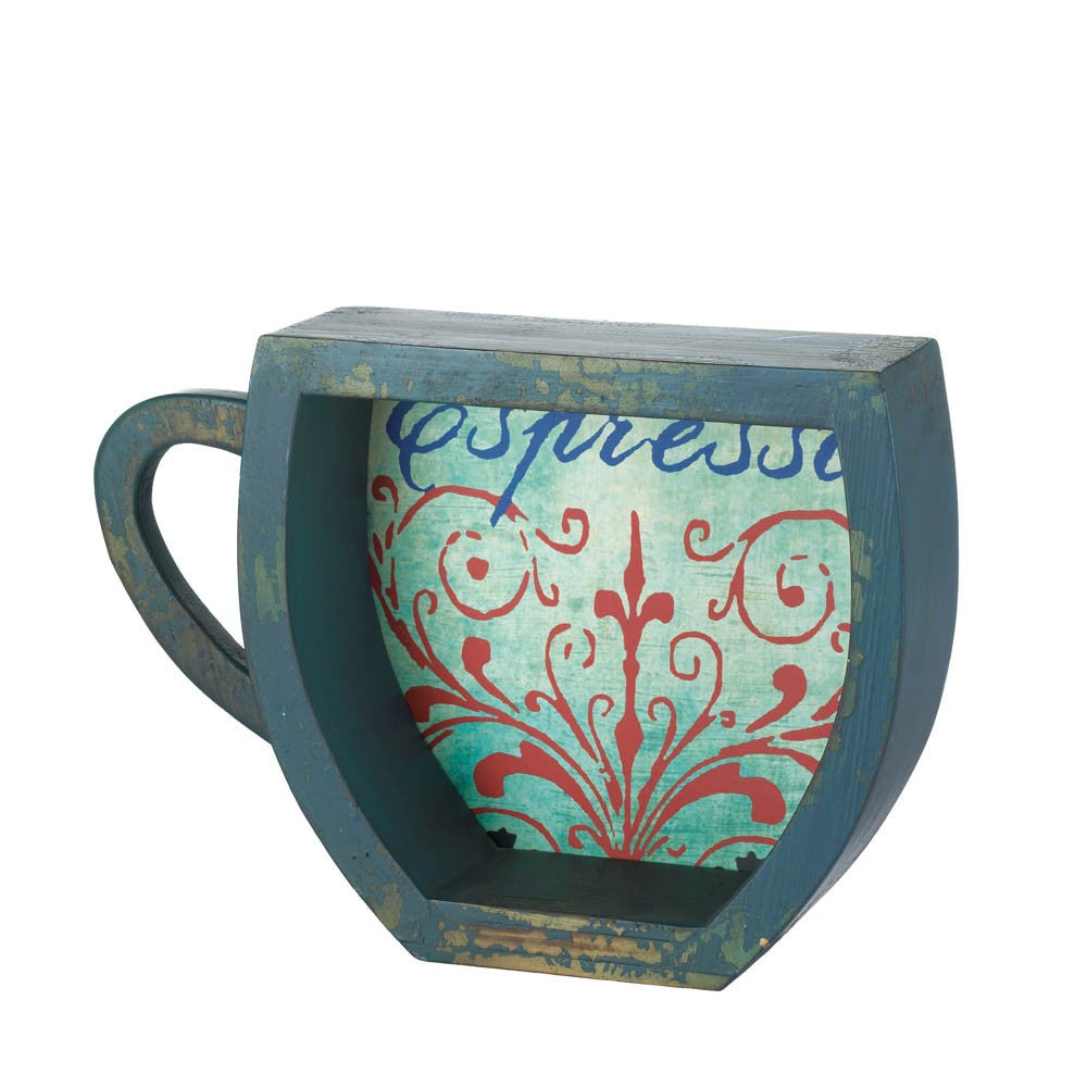 Weathered and welcoming this fantastic coffee cup shelf is the perfect finishing touch for your kitchen wall. The blue wooden frame is lined with a vintage espresso graphic and you can display this shelf solo or use it to showcase other decor accents.