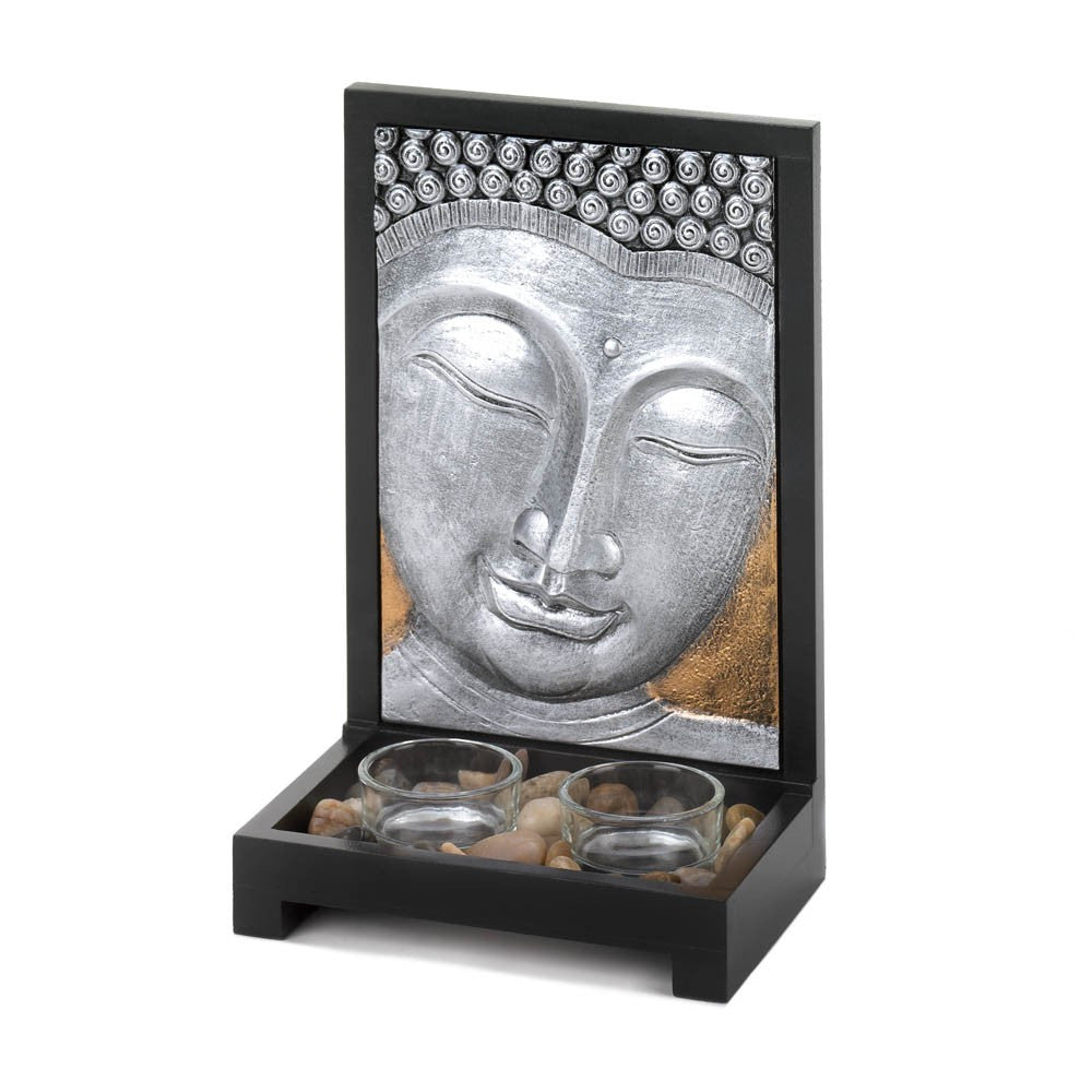 Creating a space thats equal parts calming and gorgeous is easy with this beautiful candle holder. The wood frame holds two clear glass tealight candle cups surrounded by polished stones and the standing plaque features an artistic Buddha face finished in gleaming silver. Tealight candles not included.