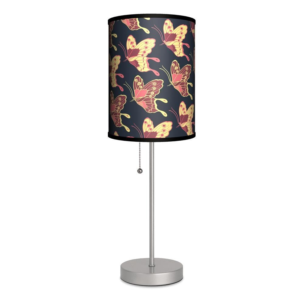 Black and bright this lamp will light up your space just right! The dark shade features a beautiful butterfly pattern with pretty colors and the slim stainless steel base allows the lamp to fit even in the tightest of spaces. Pull the cord to light up your room in beautiful butterfly style. Made in USA. Wipe clean with dry cloth. 13W light bulb not included.