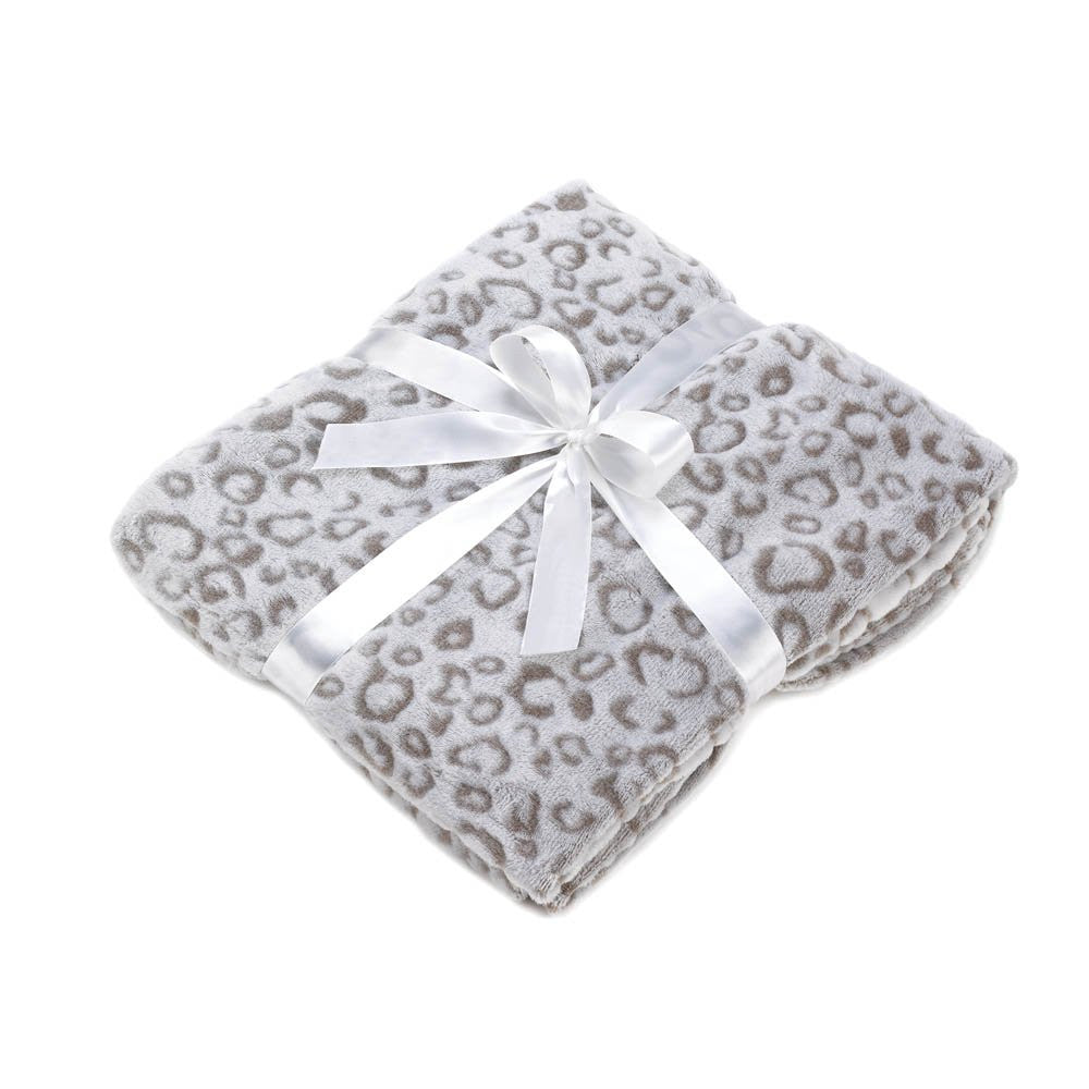 Turn your lap into the lap of luxury with this heavenly soft throw blanket. One side features rich brown leopard print while the flip side has a muted white and taupe color pallet. Perfect for your couch or bedroom!