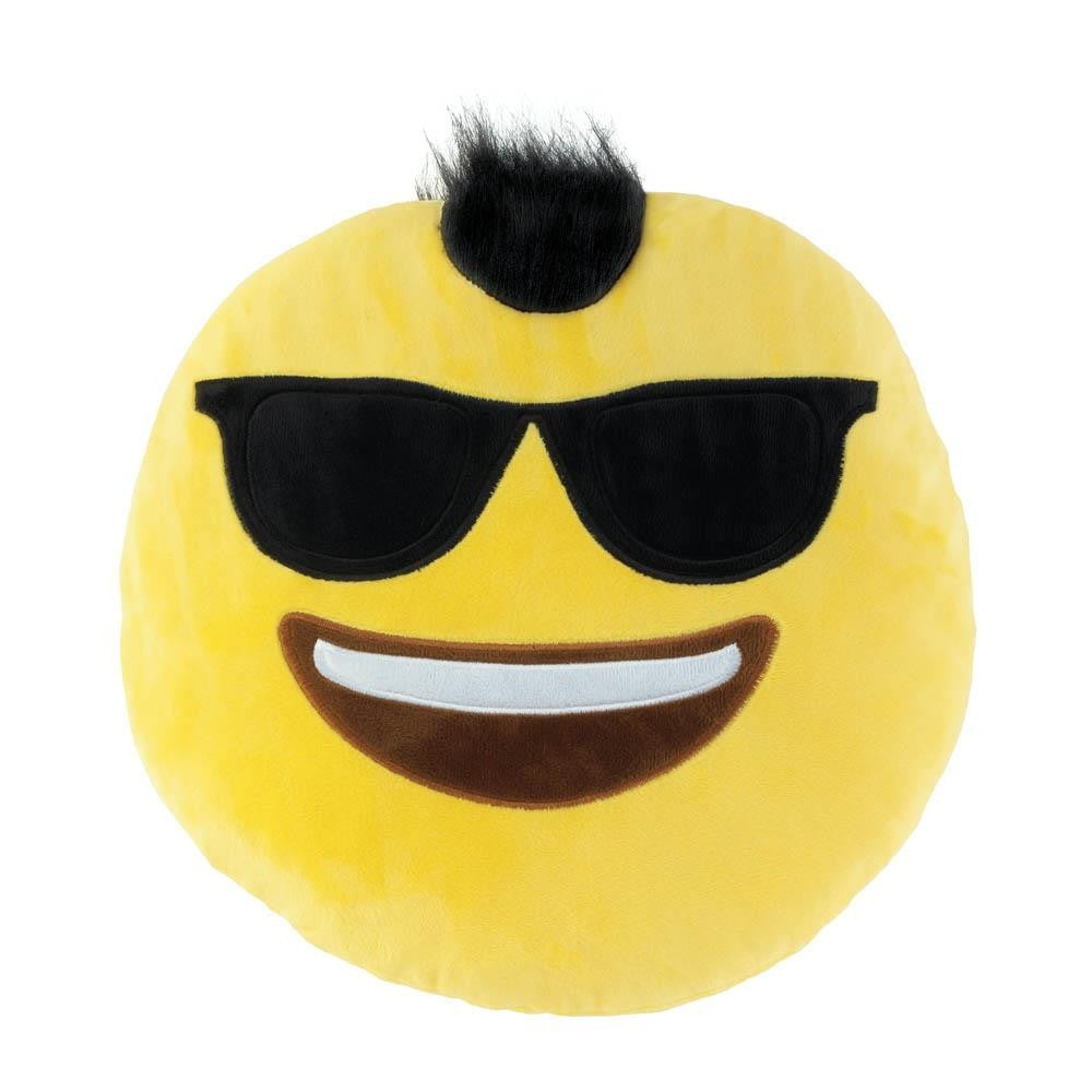 Know someone whos too cool? This throw pillow is perfect for them! Emoji text icon shaped pillow features a yellow plush exterior and the smiling face has a mohawk and cool sunglasses.