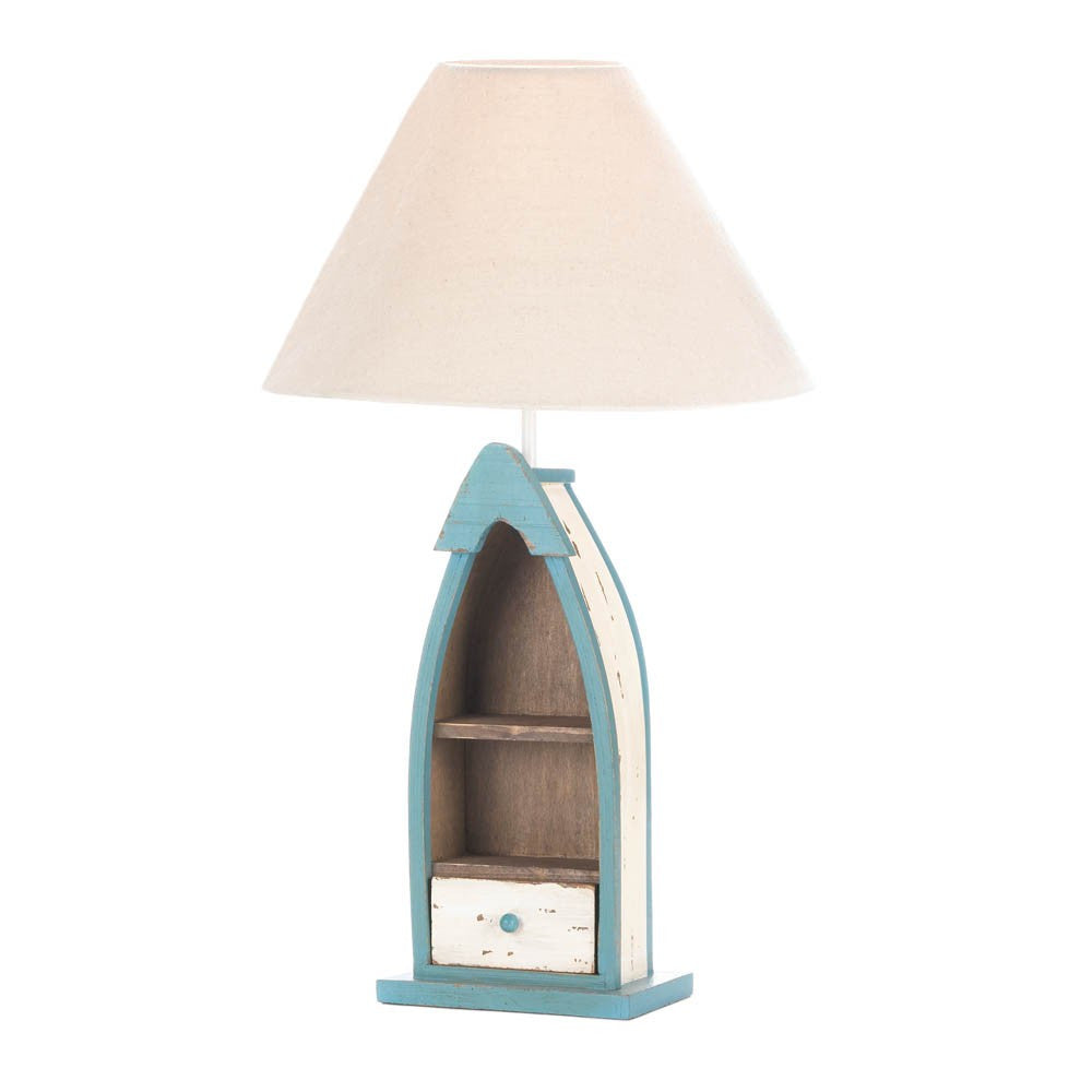 Light up your space with this absolutely charming lamp. The wooden base looks like a timeworn fishing boat painted ocean blue and white with two small shelves to display your seashore treasures and a small drawer! Its topped with a neutral lamp shade. Max 40W Type A light bulb not included. Shade: 14" diameter x 8 1/2" high; base: 6 1/2" x 4 1/4" x 14 1/2" high.