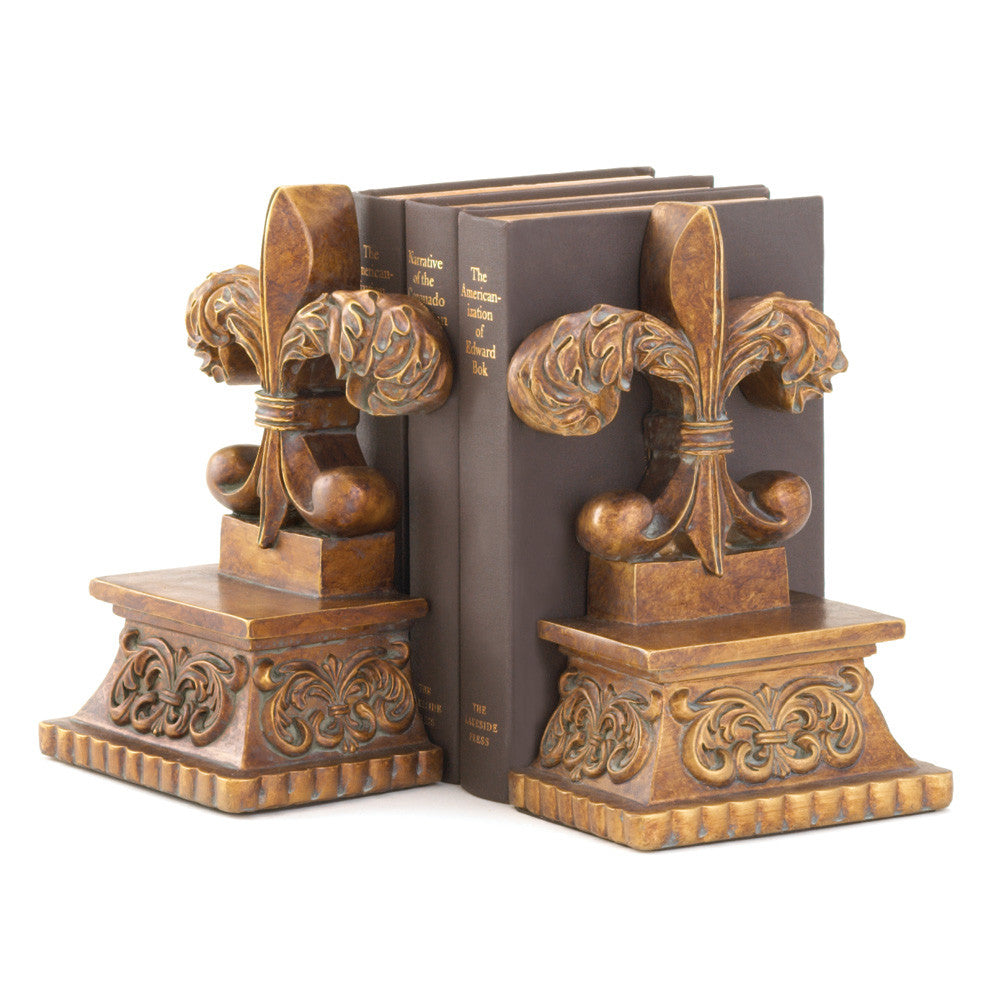 Bring the centuries-old symbol of perfection light and life to your bookshelf with this aged fleur-de-lis bookend set. Bronze-colored polyresin. 4 3/8" x 3 1/8" x 7 1/8" high.