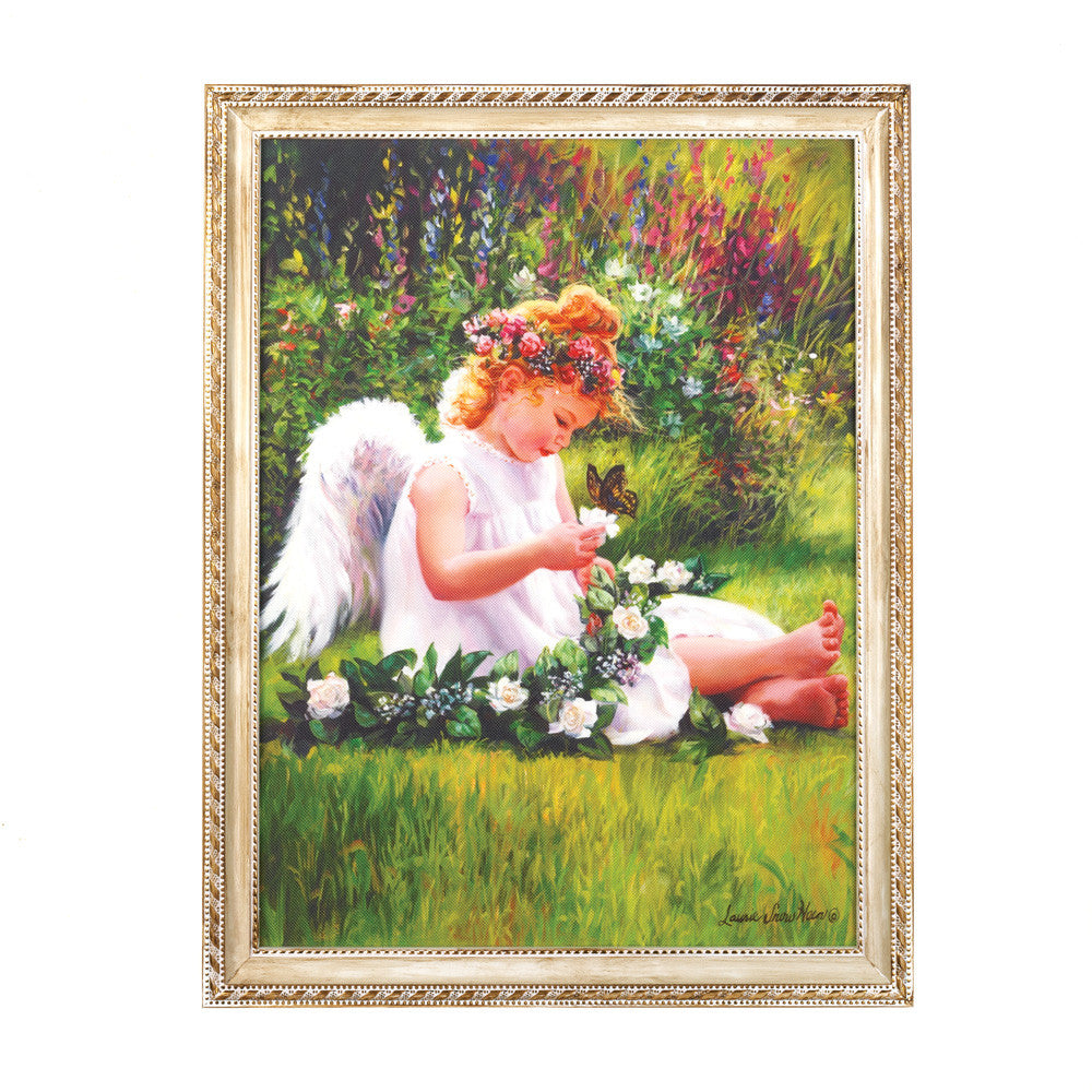 A sweet-faced angel shares secrets with her butterfly companion at the heart of a garden alive with blooms. Like a peek into Heaven this beautiful scene blesses your home with a feeling of bliss!