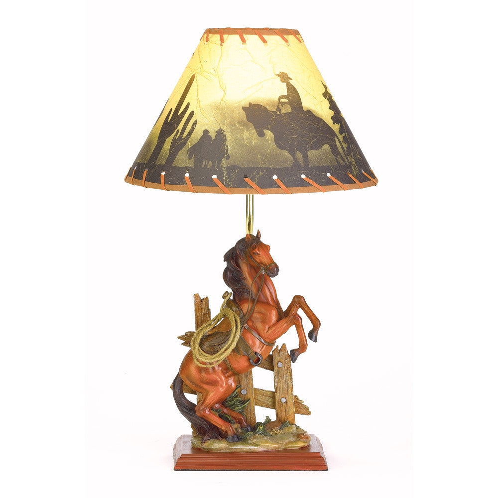 From the scenic shade to the figural base this beautiful lamp is an artistic tribute to equine beauty and grace. A stunning gift for horse fanciers and Wild West afficionados alike! Polyresin base with fabric shade. UL recognized cord. Uses 40-watt bulb (not included). 12 1/2" diameter x 22 3/4" high.