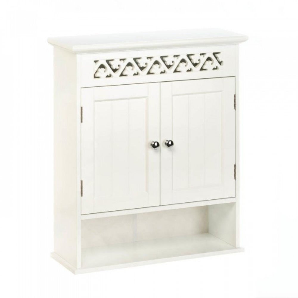 This charming wall cabinet looks great and helps keep clutter out of sight! Made from wood and painted white it features a lower display shelf ivy lattice cutout design at top and two hinged doors that hide shelves inside.