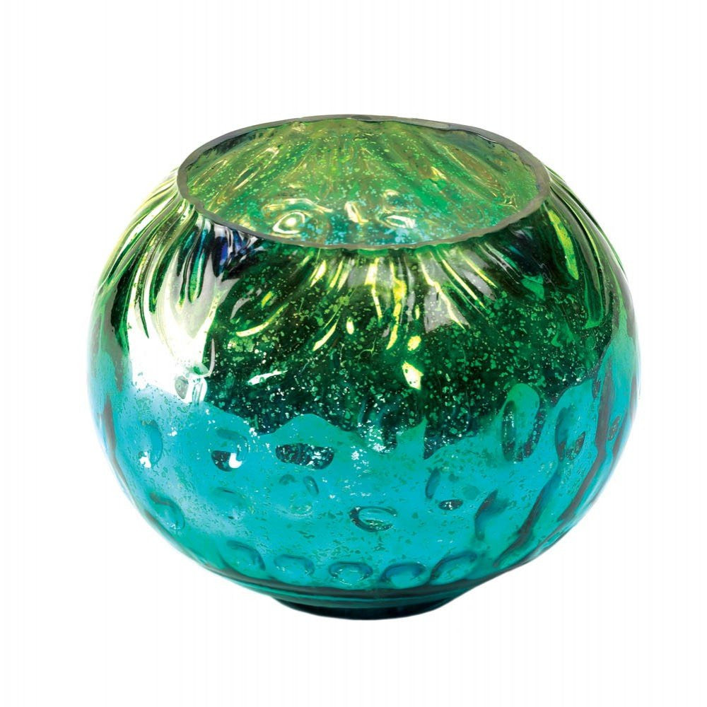 Inspire your decor with shimmering colors inspired by the warmest spot in the deep Mediterranean. This voluminous candleholder will make simple candlelight sparkle with greens blues and golds and the stylized texture of the glass will make it a standout in your living space. Candle not included.