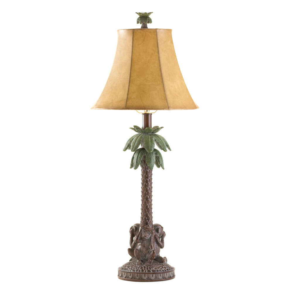 The rich mahogany trunk of a tropical palm holds a classic fabric lampshade aloft as three lazy monkeys sit see speak or hear no evil at its base. UL recognized. Max. 60-watt bulb (not included). Polyresin. 12" x 6" x 27 1/2" high.