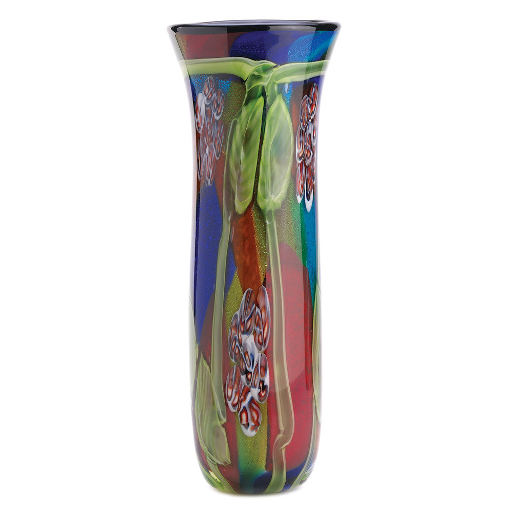 Like the magnificent feathers of a peacock’s tail a dazzling fusion of color and shape adds lustrous life to this regal glass vase. A theatrical centerpiece that transforms a room into an elegant gallery of modern art! Decorative purposes only. Each piece is individually hand-crafted for its unique beauty; therefore it may have slight differences from the pictured item.