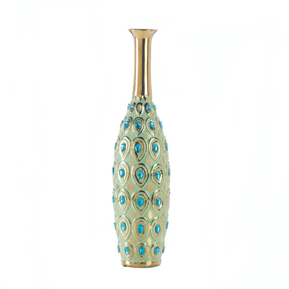 This dazzling long-neck vase is ready to strut its style on your mantel table or shelf. Its beautiful peacock design is highlighted by shimmering gold touches and turquoise jewels that sparkle and shine.