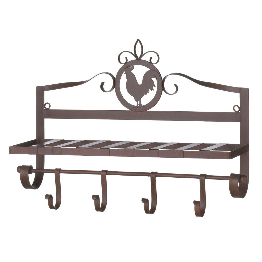 Get organized with a healthy dose of country charm! This iron wall rack features a slatted shelf and four generous hooks to help keep things tidy. Contents not included.