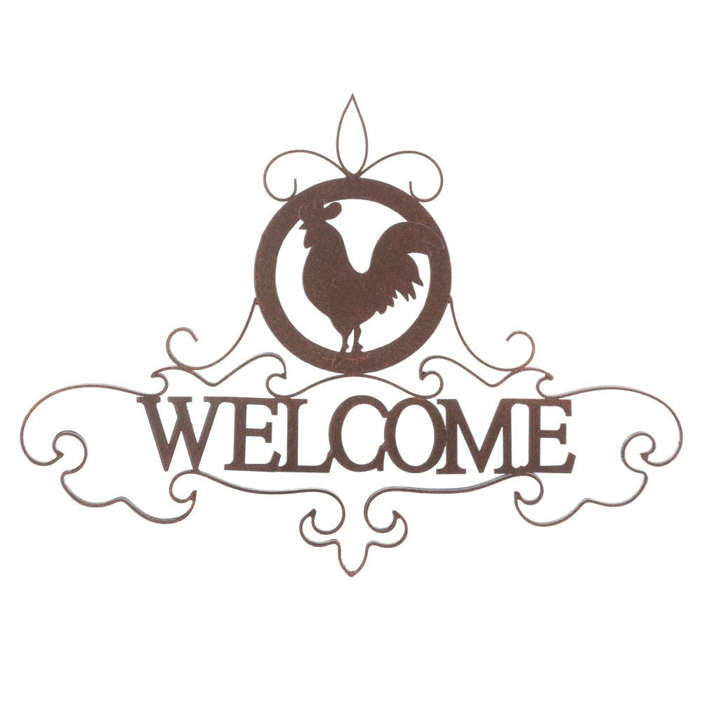 Welcome your guests with a dose of country charm! This lovely iron sign features a country rooster medallion and fanciful iron wisps that will make your home even more welcoming.
