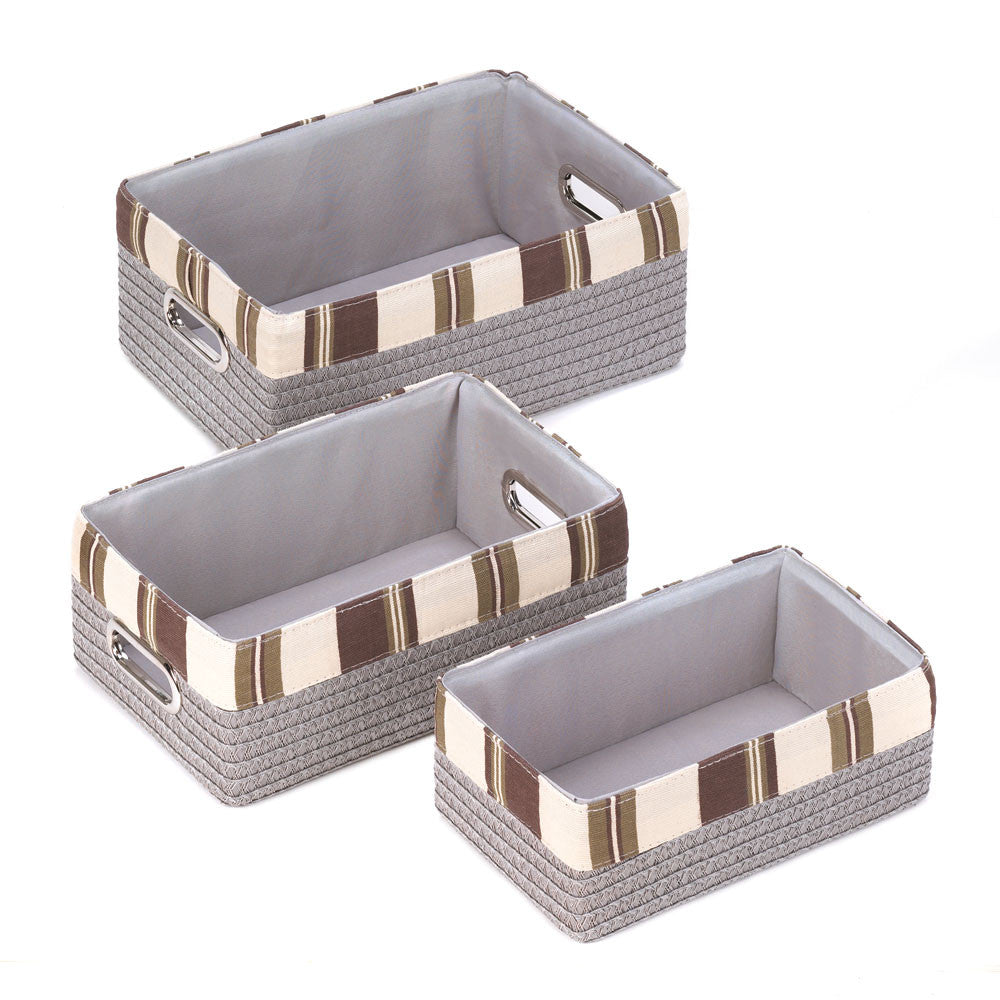 Organizing made stylish! This set of three nesting baskets features a lovely taupe woven exterior with matching lining and is perfect for getting things in order in the bathroom kitchen in the entry way and beyond. Highlighted by striped fabric and silver handle hardware and featuring a trio of convenient sizes you can nestle a variety of items inside this set for beautiful storage.