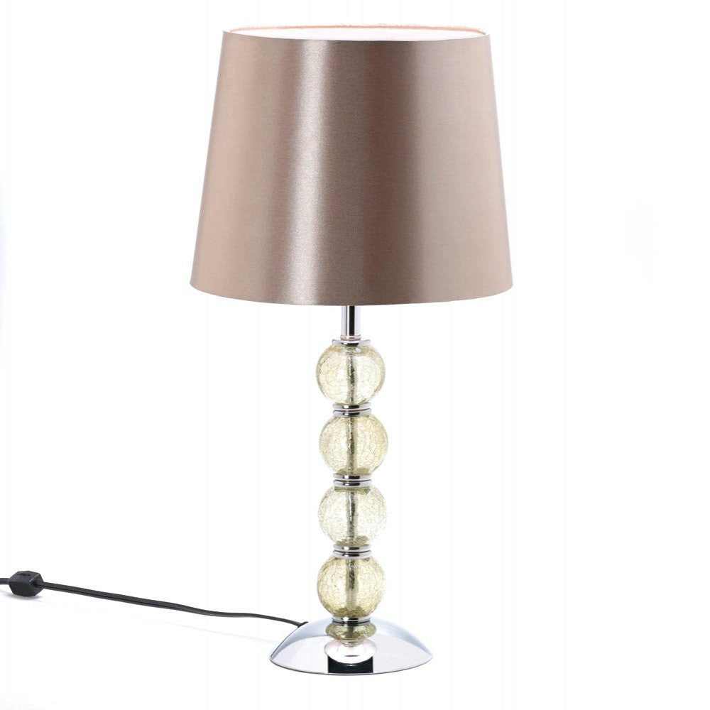 features crackled glass orbs and a mocha shade with subtle sheen.