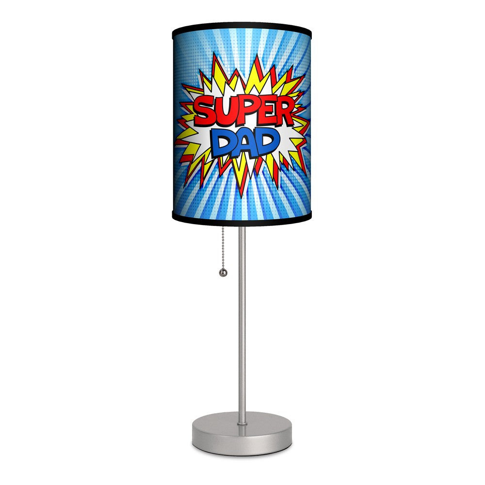 He may not be faster than a speeding train or stronger than 10 men but that doesnt mean Dad isnt a super hero! This slim table lamp features comic book-worthy pop art on its shade that tells the world a Super Dad lives here. Pull the stainless steel cord to illuminate the room at the speed of light! Made in USA. Wipe clean with dry cloth. 13W light bulb not included.