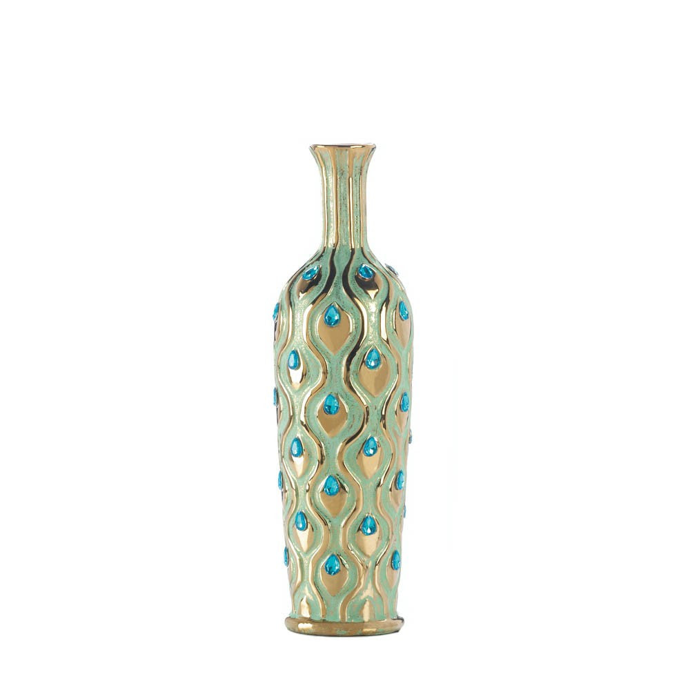 Wow your guests with this dramatic peacock-inspired vase that will draw their attention and admiration. Golden accents and turquoise jewels sparkle and shine in any light.