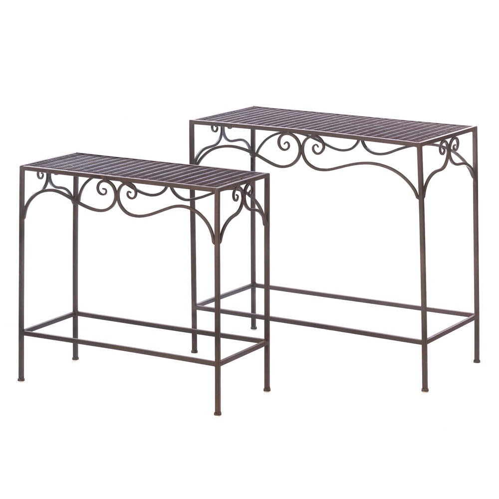 Long and slender these chocolate brown nesting tables are perfect for just about any space. The woven wicker tops have effortless style and the scrolling iron table frames are gorgeous too. Two sizes to fit your living space. Large: 33 1/8" x 15" x 29 1/2" high; small: 28" x 11 7/8" x 26" high.