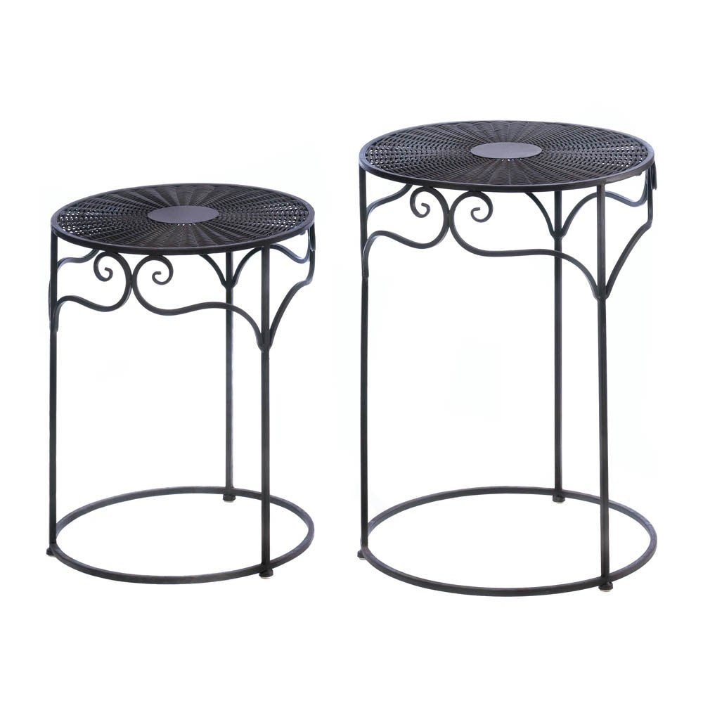 Youre going to love this duo of charming woven wicker-top tables that will fit just about anywhere. The deep brown wicker tops are a great complement to the dark iron table frames that feature pretty flourishes. Nest them together to save space when not in use. Large: 18 1/8" diameter x 24 1/4" high; small: 16 1/8" diameter x 20" high.