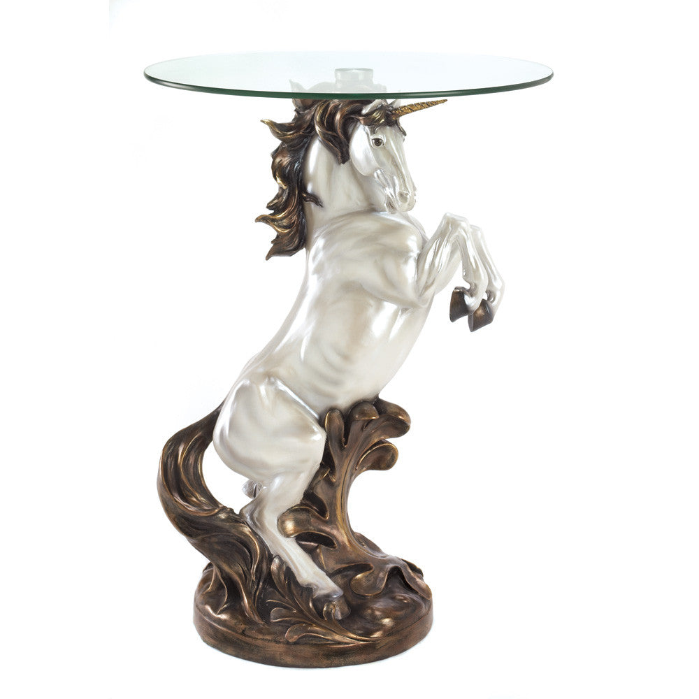A golden-maned unicorn stands resplendent in the shy light of dawn; the very image of magic and might. Captivating statue base gives this fantasy table a legendary appeal! Clear glass top allows enjoyment from every angle. Weight 15.4 lbs. Polyresin base with tempered glass top. 18 3/4" x 16" x 25 1/2" high. May Require Additional Freight Charge. Some Assembly Required