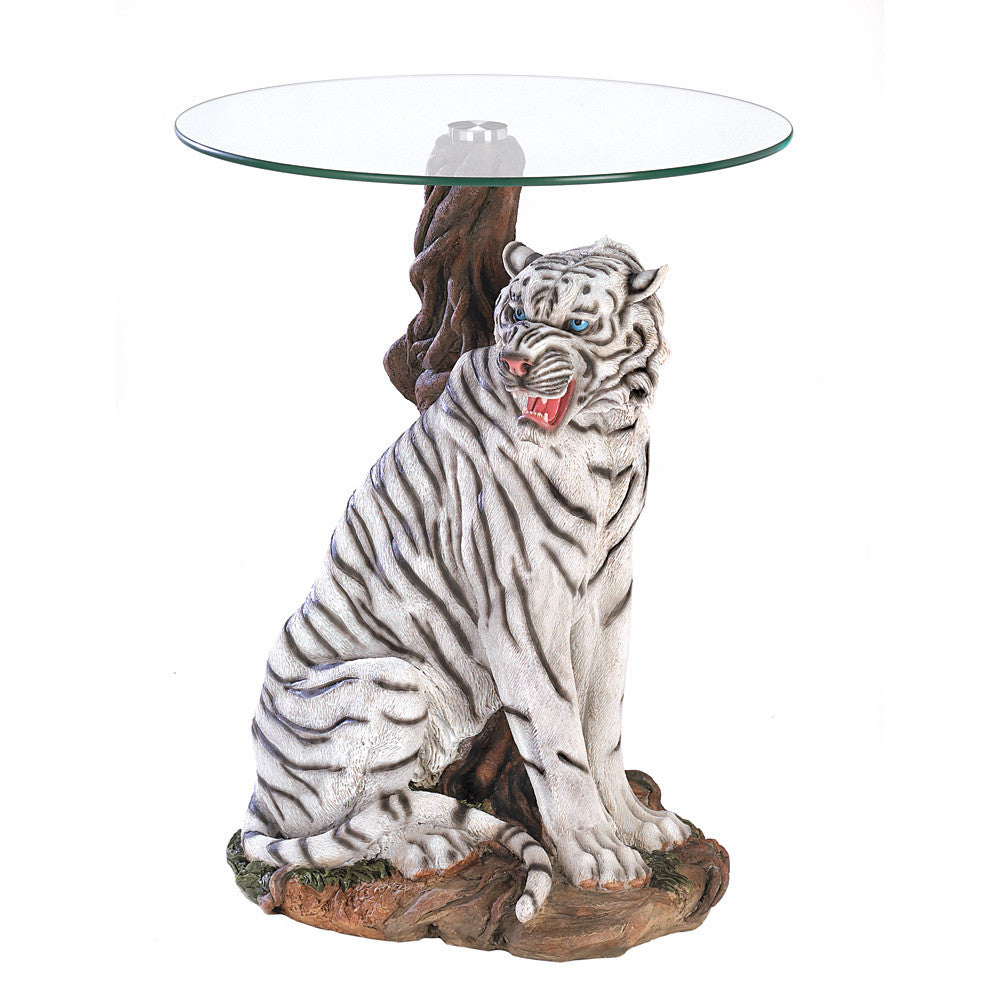 A rare white tiger is captured in all his beauty and might forming a stunning sculptural base for furnishing of singular distinction. Each detail of this stately statue is lovingly rendered for absolute lifelikeness; a perfect portrait of this magnificent predator at the height of his power and grace. Place this dramatic accent table in a place of pride within your home and be the envy of every collector!