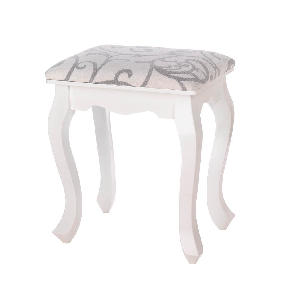 You could easily find the perfect spot for this beautiful foot stool in just about every room of your home! White wood frame features romantic curved legs while the padded cushion is covered with wintery white fabric that swirls with willowy taupe flourishes.