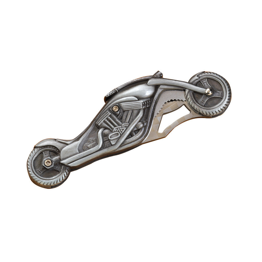 Motorcycle fans this knifes for you! Bold styling features sleek chopper figural handle and a gleaming blade etched with a racetrack design for a look no bona-fide biker can resist. Weight 0.1 lb. Stainless steel and zinc alloy. 4 3/4" x 1/2" x 1 1/2" high; 8 1/4" long when opened.