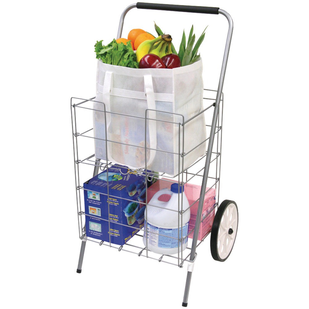 Fold-down Shelf For Extra Storage & Fragile Items Integrated Hook To Hang On To Supermarket Wire Cart Perfect Size For Public Transportation Lightweight Yet Sturdy Comfort-grip Foam Handle 9" Dia Wheels Quick & Easy Assembly Folds Flat For Storage Stores Conveniently In Trunk Weight: 9lbs Capacity: 50lbs