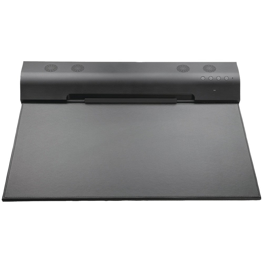 Desk Pad With Integrated Bluetooth and aux-input Speaker System 4 Speakers (2 Tweeters & 2 For Bass Response) Soft Leather-like Pad Protects Desktop From Stains Scratches & Spills & Creates A Comfortable Writing Space Built-in Buttons Include Volume Control Fast Forward Rewind & Play and pause 19" X 24" Includes 6ft Micro USB A and c Power Adapter & 3ft 3.5mm Audio Cable Black Leatherette Finish
