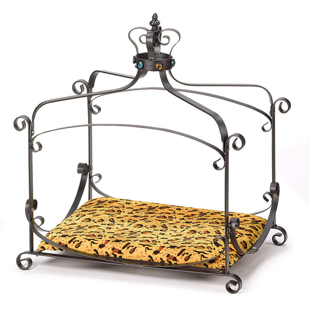 Brightly bejeweled and lushly outfitted in decadent animal-print velvet this lavish bed is the "purr-fect" place to pleasingly pamper your four-footed friend! Cats and smaller dogs alike will delight at the sight of this marvelous piece of fabulous furniture” sized just right to be all their own” no humans allowed! Matte-finish wrought-iron frame is fittingly topped with a jeweled "crown."