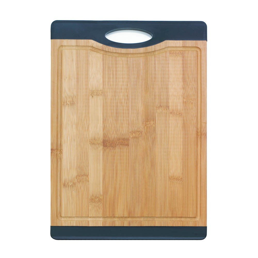 The beauty of bamboo and the no-nonsense grip of rubber will put you in food prep bliss. The bamboo cutting surface is very generous and the black grips add a functional and modern touch to this essential kitchen accessory. Hand wash only; dry with a cloth.