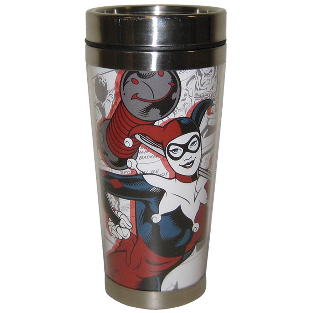 Drink up puddin! Now you can drink coffee with your favorite Gotham villain! The Batman Harley Quinn 16 oz. Travel Mug is made of plastic and stainless steel. Mug holds up to 16 ounces of liquid. Hand wash only. Not microwave safe.