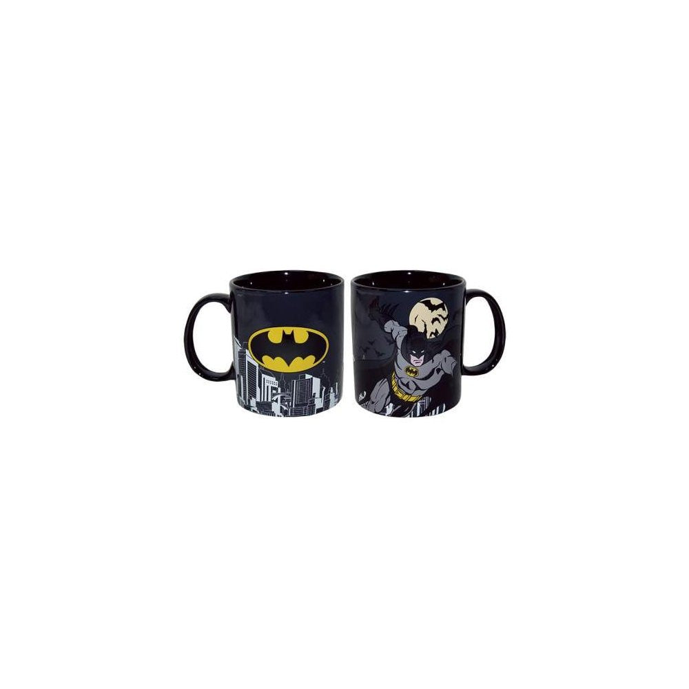 From the DC Comics collection this black ceramic Batman 14 oz. mug features the Bat logo on one side and an image of the Caped Crusader in an action pose with Gotham bats and a full moon in the background on the other. Hand wash only. Not microwave or dishwasher safe.