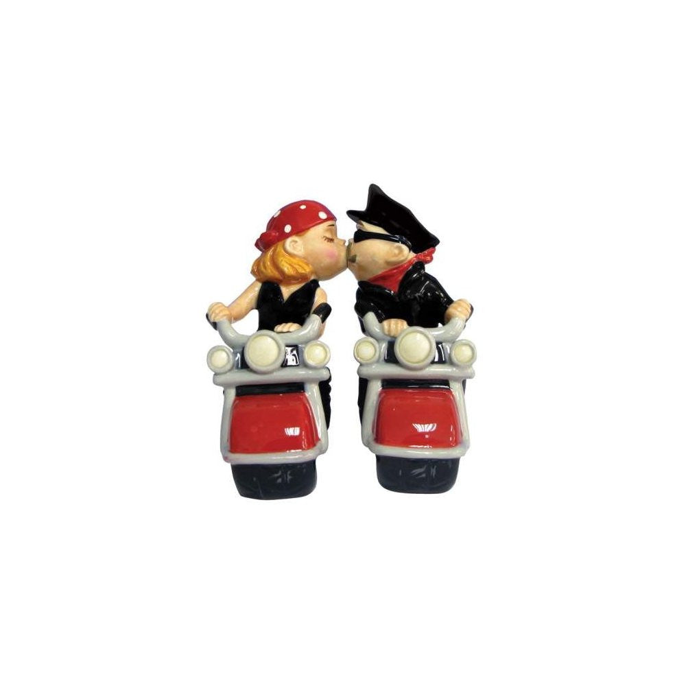 These adorable bikers are ready to spice up your table! Salt and pepper shakers feature magnets in their kissers to keep them lip locked as they cruise down the highway of love. Fun for your table or the perfect gift for the two-wheeled enthusiasts in your life.