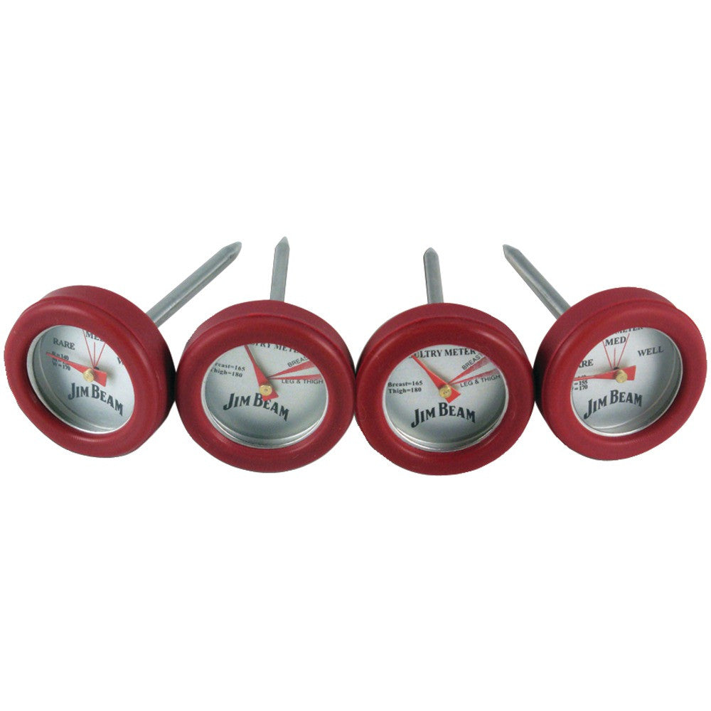 1X Jim Beam Jb0134 Poultry & Steak Mini Thermometers 4 Pk 4-piece grill thermometer Compact design Chrome finish includes 2 steak & 2 poultry thermometers. Offers an easy-to-read display which shows rare medium & well done temperature ranges for steaks. A poultry thermometer displays the optimum temperature range for chicken & other poultry meats. Compact Design Chrome Finish Includes 2 Steak & 2 Poultry Thermometers Easy-to-read Display Shows Rare Medium & Well Done Temperature Ranges For Steaks Poultry Thermometer Displays The Optimum Temperature Range For Chicken & Other Poultry Meats