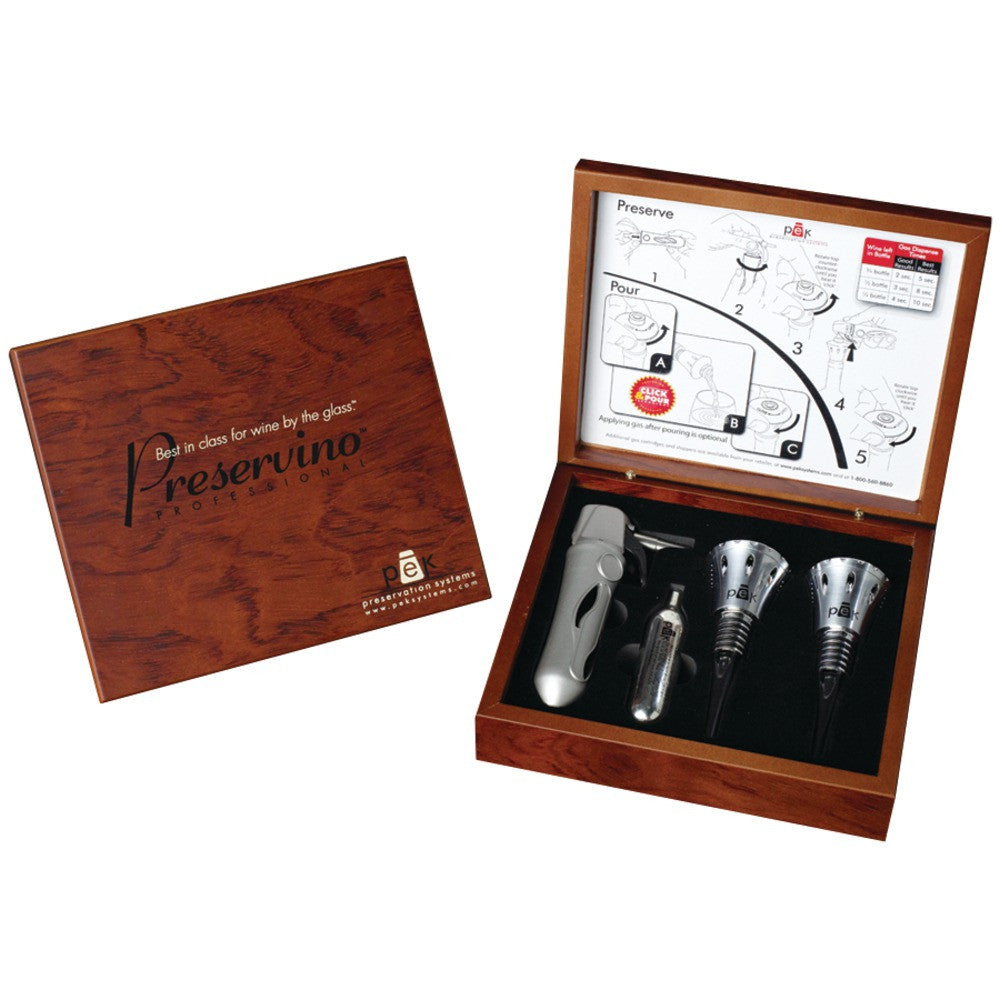 Packaged In Beautiful Rosewood Gift Box Stylish Chromed Click & Pour Stoppers Save 67% In Argon Usage Locks In Freshness Includes Dispenser An Argon Cartridge & 2 Click & Pour Professional Wine Stoppers