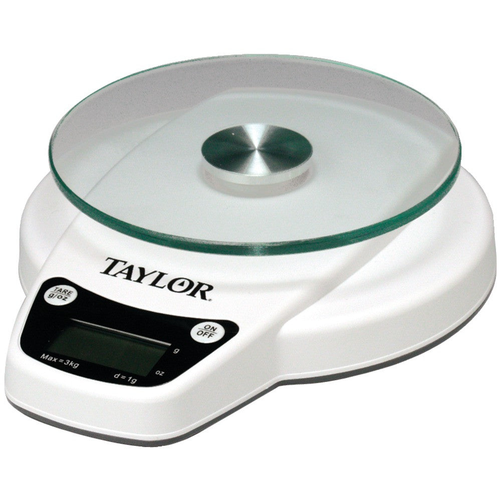 The Taylor 3800 Classic Digital Kitchen Scale is styled in white with a black bezel area around the display and a glass weighing platform. The white control pushbuttons on the bezel are smooth (covered) and thus easy to wipe clean. The bottom of the scale is gray and on it are four non-skid feet. Two long-life lithium button cell batteries are included and preinstalled. Tare On and off & Automatic Shutoff Functions Weighs In Ounces Or Grams Weighs Directly On Platform Or Use With Bowl (not Included) 6-lb Capacity In .1-oz Increments Includes 2 Lithium Batteries 5-year Warranty