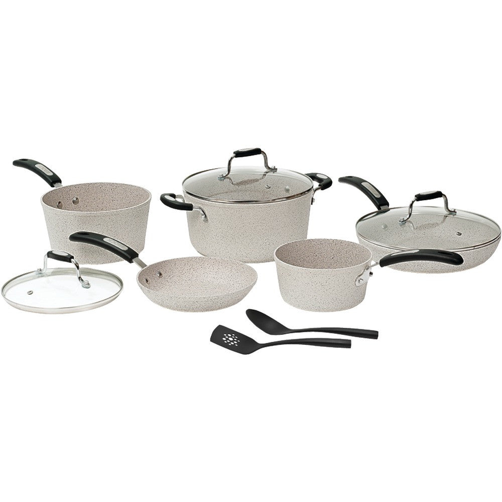 • Includes 1.5qt Saucepan With Bakelite Handle 3qt Saucepan With Glass Lid & Bakelite Handle 5qt Stock Pot With Glass Lid & Bakelite Handle 8" Fry Pan With Bakelite Handle 10" Fry Pan With Glass Lid & Bakelite Handle Nylon Spatula & Nylon Ladle