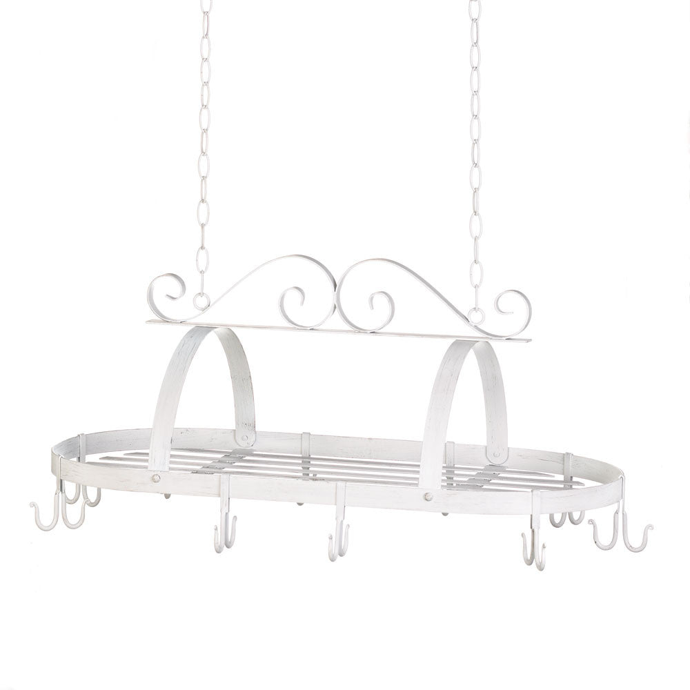 Keep your pots and pans within easy reach with this lovely hanging holder. Scrolling white metal and a slated center for additional storage this hanging rack will free up in-demand cupboard space.