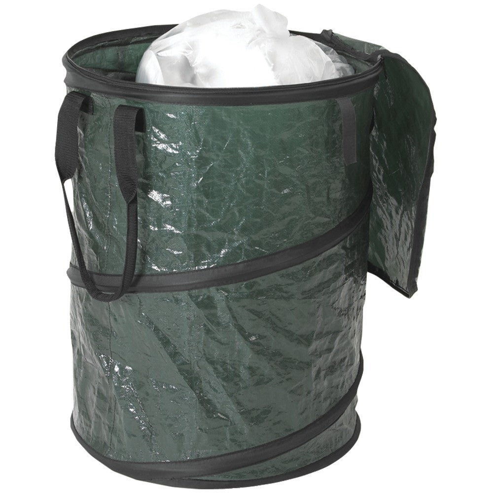 Environmentally sensitive campers can now take a lightweight collapsible trash container with them to their campsite. This uniquely versatile container can double as ball bag towel bag at the beach or gear bag. It is made of heavy duty polyethylene fabric. It features a fully zippered top and 2 padded web strap carry handles. Can Double As Ball Bag Towel Bag At The Beach Or Gear Bag